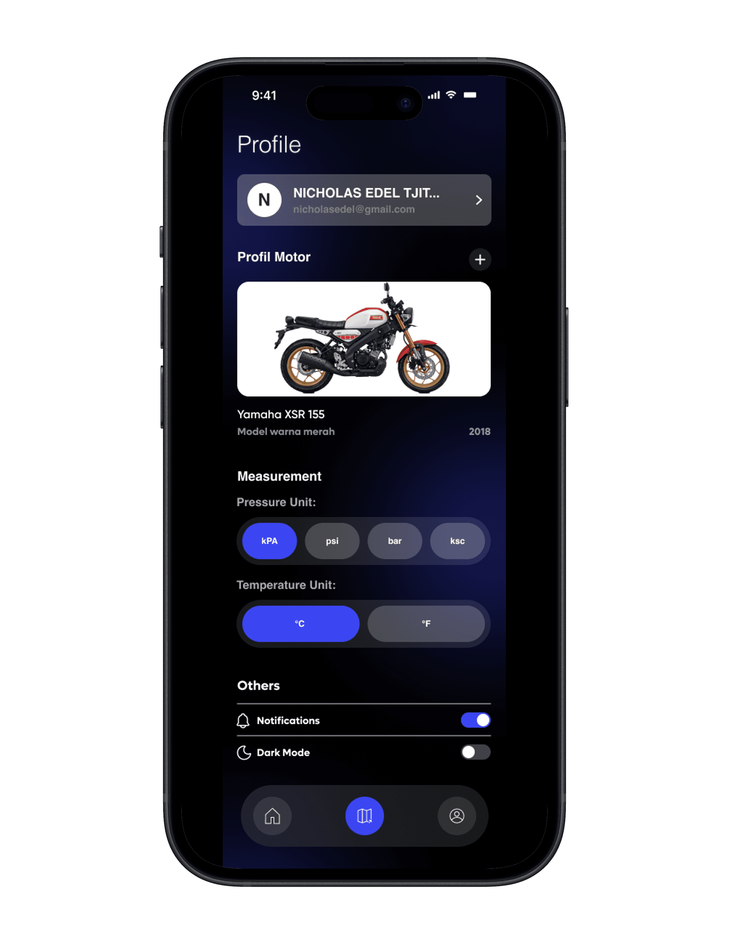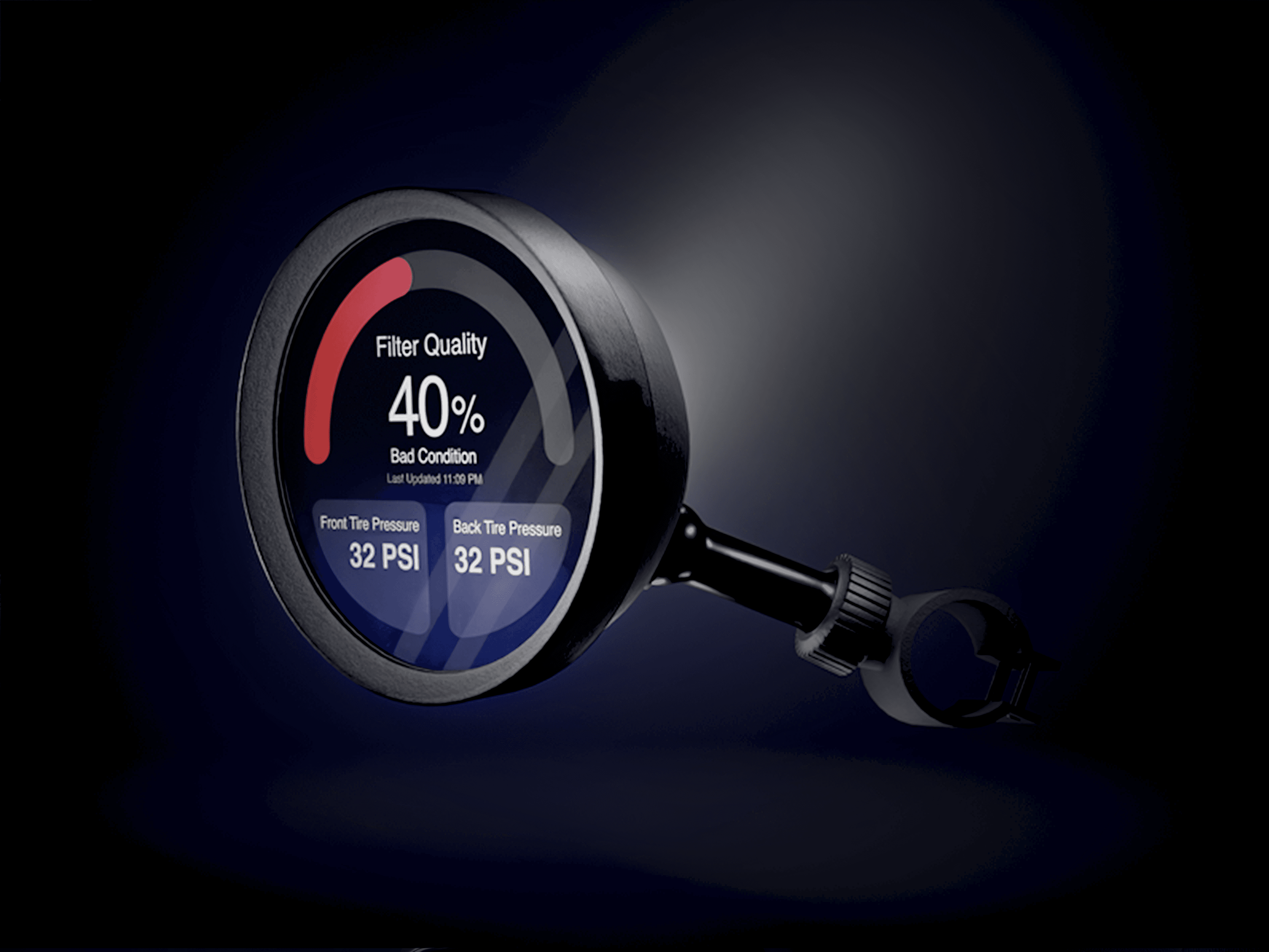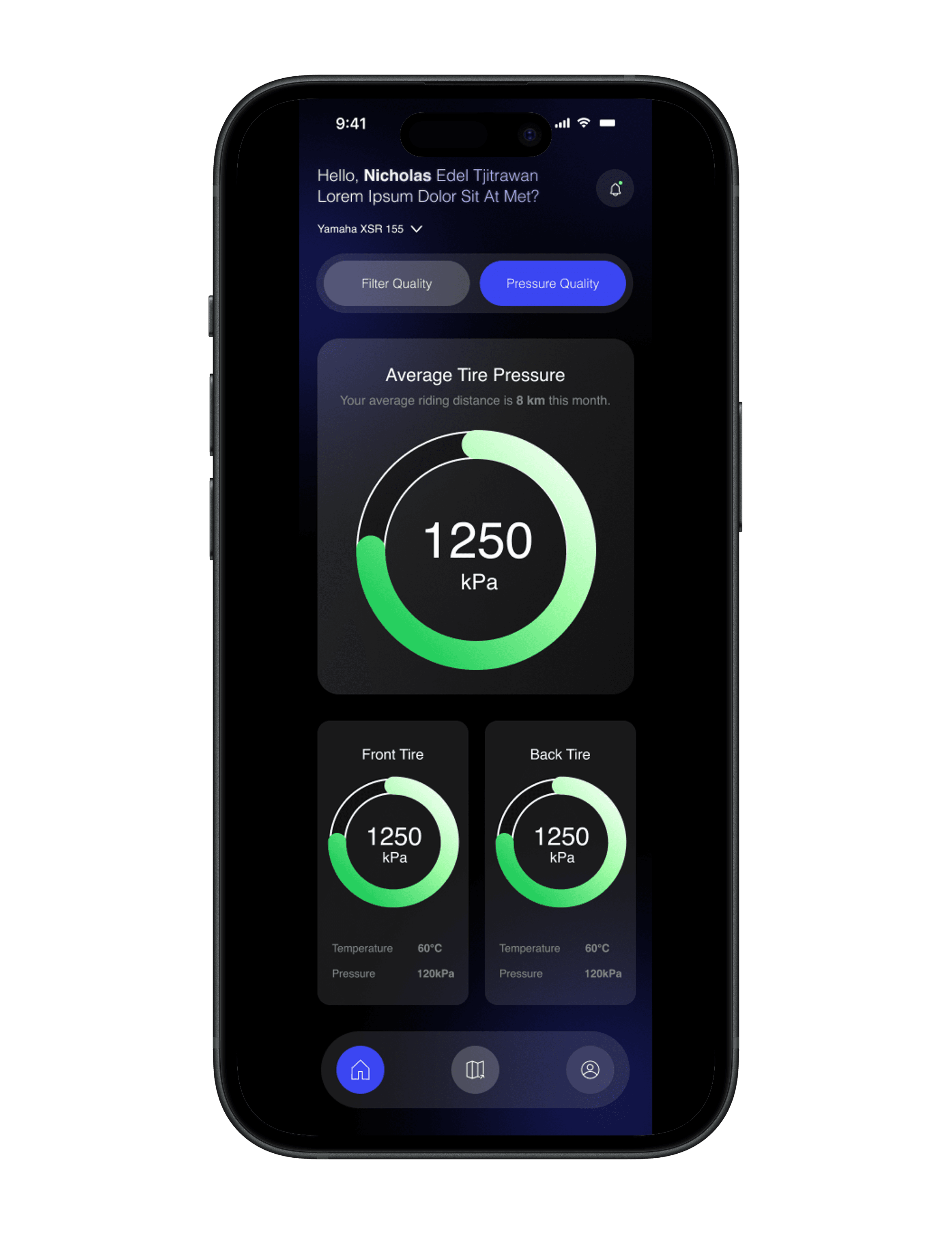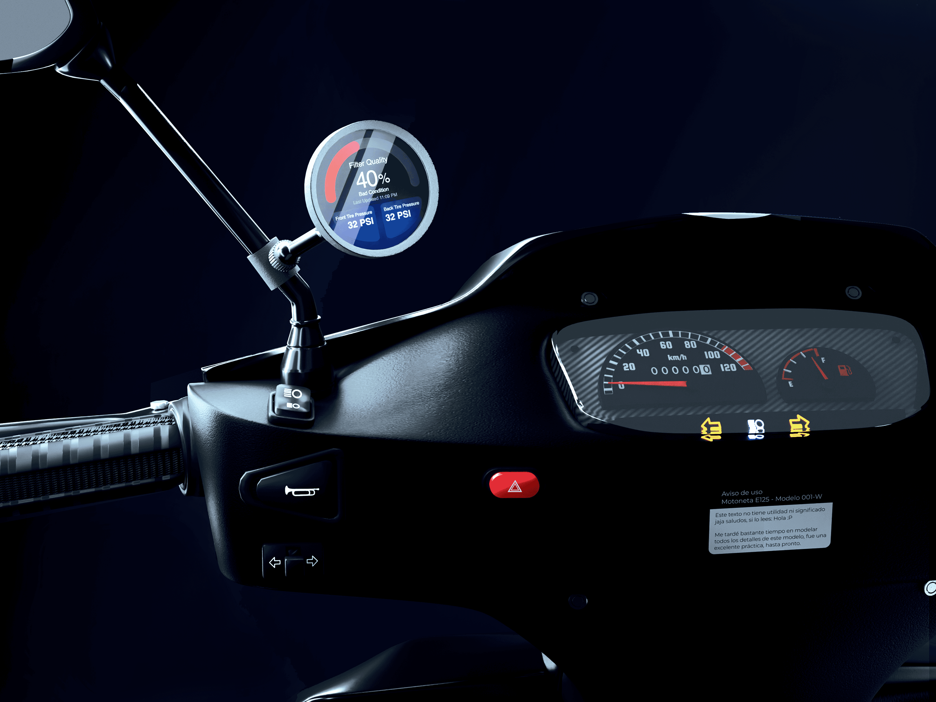 To address this problem, this tool provides an intuitive application that guides users in monitoring their motorcycle filters through step-by-step instructions, timely reminders, and real-time data on filter performance and air quality, ensuring better maintenance and helping reduce environmental impact. The visual direction centers on the contrast between structure and fluidity, creating a balanced identity that gives off information